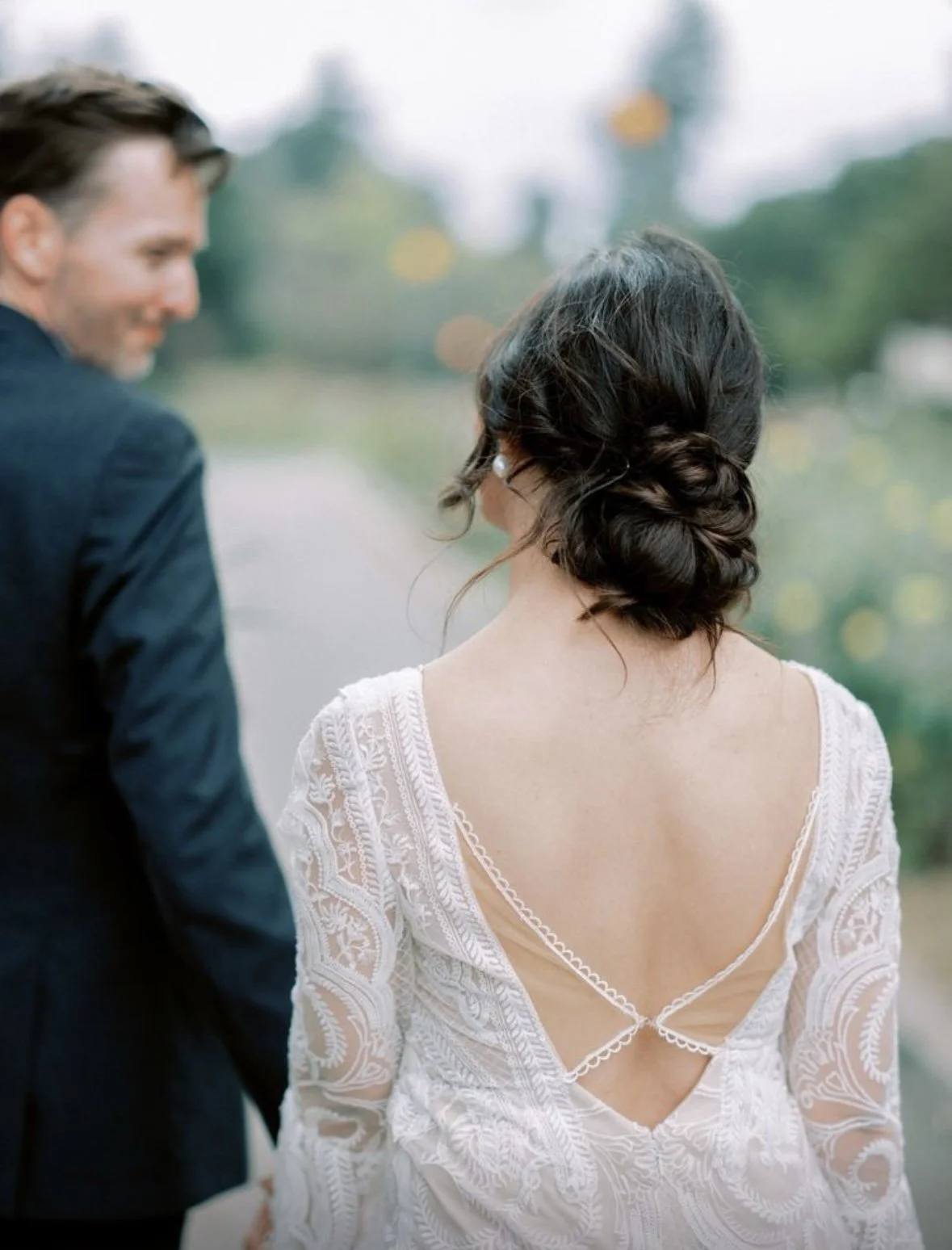 …Weeks prior to the wedding , she came to my house to do a practice run; she listened to what I wanted, talked through it with me, and got the right style in her first attempt. On my wedding day, Courtney perfectly recreated the updo: a low chignon with face-framing waves, just the right balance of elegant and formal with a touch of ease….Our hair lasted all day and night. My updo never felt loose and my cousin’s waves and volume never fell flat. Both styles looked so good in my wedding photos.